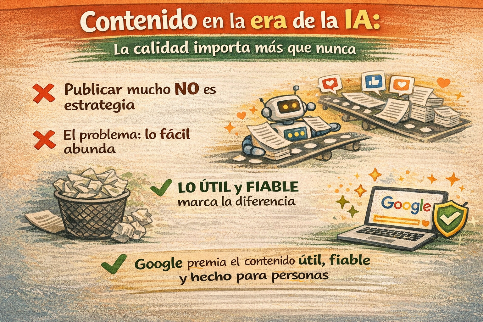 Por eso la calidad es más importante: Google insiste en priorizar contenido útil, fiable y centrado en las personas, y en evitar contenido hecho “para atraer visitas” con automatización masiva sin valor añadido.